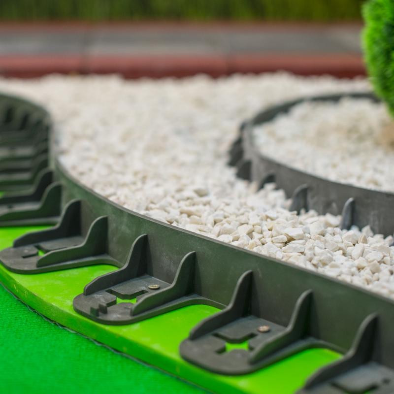 Ez a műanyag ágyásszegély szükséges kellék a kertjében, ha különböző területeket szeretne elválasztani. Alkalmas a fűágyás és más célú kertrészek elhatárolására, ideális kerti gyalogutak, vízelvezető és víznyelő kialakításához, valamint dekoratív védőgátak, fák és bokrok körüli vízelvezetéshez. Segít optikai térválasztást kialakítani és virágágyások tervezésére is tökéletes.
